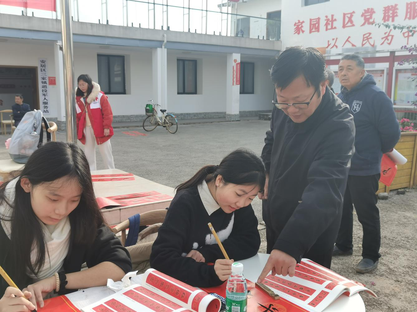 近日,安居中学组织书法社团学生前往三家镇、玉丰镇开展了 “经典润乡土 祝福进万家” 写春联活动。