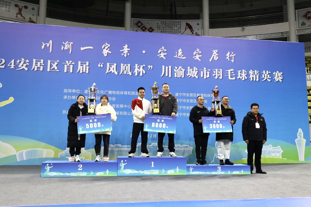 12月8日,“川渝一家亲·安逸安居行”2024安居区首届“凤凰杯”川渝城市羽毛球精英赛决赛在安居体育中心火热上演。经过两天、210场比赛的激烈比拼,“遂宁顶事”队凭借出色的发挥,成功夺得冠军,“绵阳暴龙”队和“自贡明悦”队分别获得亚军和季军。