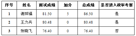 根据遂宁市安居区国有资产监督管理委员会、遂宁市安居区人才服务中心《面向社会公开选聘遂宁福安安居城镇资产经营有限公司副总经理的公告》的规定,现将考生面试成绩、加分、总成绩和进入政审人员名单公告如下。公示时间为3个工作日。