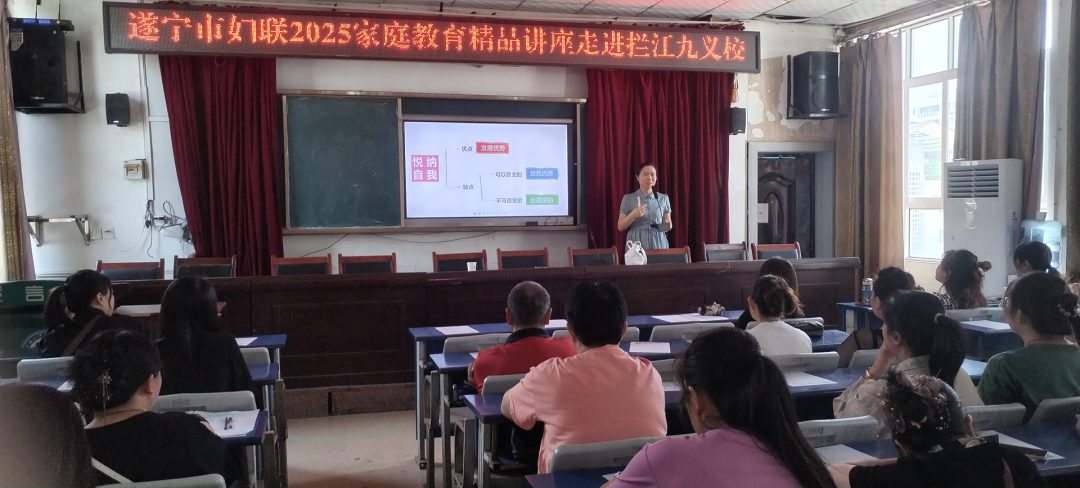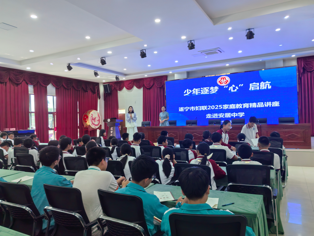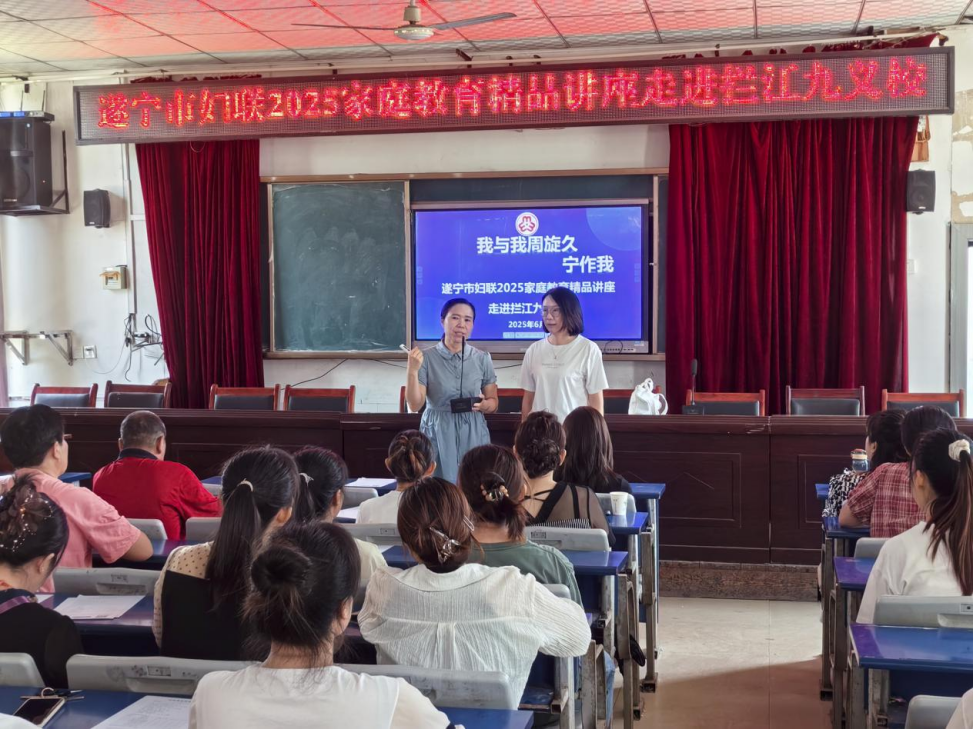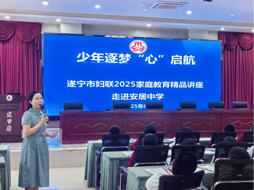 2025年6月16日,遂宁市妇联2025家庭教育精品讲座走进周末假日寄宿制学校——安居拦江九义校和安居中学,国家高级家庭教育指导师、国家二级心理咨询师、遂宁市家庭教育促进会副会长、遂宁市心理教育协会副会长曾赵容老师为两所学校200余名家长和学生带来专题讲座。
