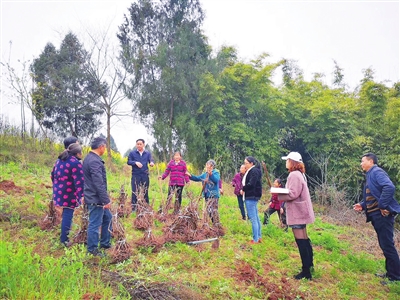 遂宁市龙婷生态农业有限公司董事长张天伦一来到村上,便与村民探讨种植葡萄树地方,在选好适宜栽种的地方后,公司相关人员与村民将葡萄苗一一整理,准备栽种。张天伦一边给村民示范栽种,一边耐心地给村民讲解怎么种植葡萄树,如何加强对葡萄树的管护,同时向村干部讲授如何加大对葡萄种植户的技术培训等。