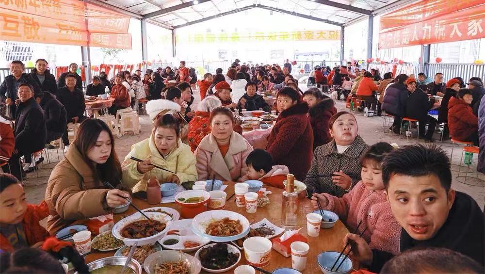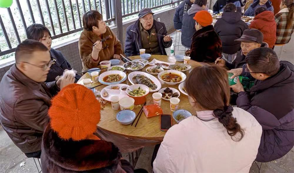 正月初三,凤凰街道陷马堰社区刘家坝小区内的停车场里,22张圆桌依次排开,200余名村民呼朋唤友、依次入座,一场丰盛的“坝坝宴”即将“开席”。
