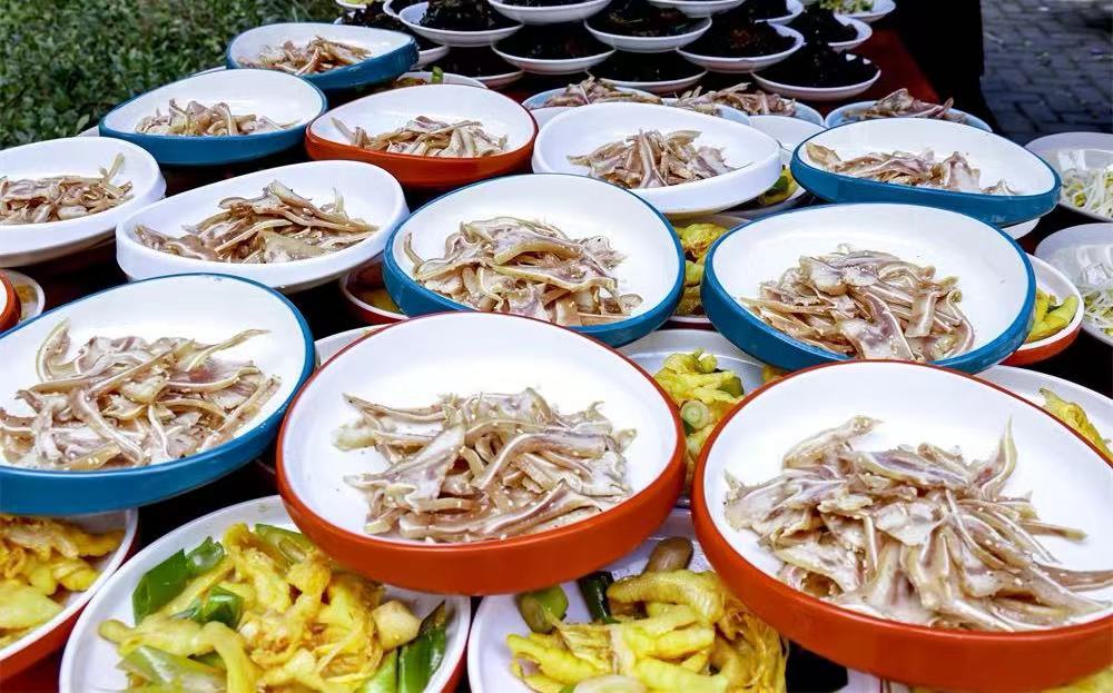 “上菜啰……”中午12时许,随着一声响亮的吆喝,端着各种菜肴的“服务员”鱼贯而入。白灼大虾、凉拌猪耳朵、清蒸桂鱼……“坝坝宴”正式开席。