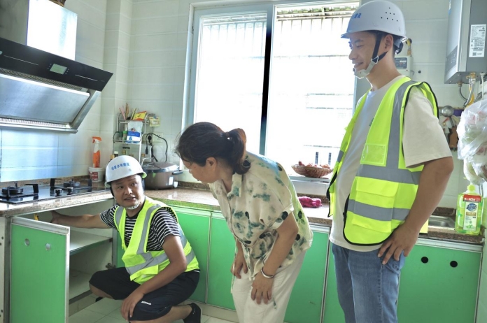 另一边,凤凰半岛一期的燃气管网也正在改造中。记者走进小区看到,居民楼外多出了一条条崭新的黄色燃气管道,顺着高耸的小区楼栋爬墙而上,延伸至每户居民家的厨房。施工人员正在裁切管道,对居民家中的燃气自闭阀、报警器、切断阀、老旧管道等进行更换和加装。