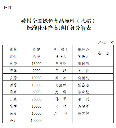 根据农业部绿色食品管理办公室和中国绿色食品发展中心《关于发布第十一批创建全国绿色食品原料标准化生产基地名单的通知》(农绿科〔2011〕7号)要求和《全国绿色食品原料标准化生产基地续报管理办法(试行)》(农绿科〔2012〕22号)精神,安居区成功创建全国绿色食品原料(水稻)标准化基地进入续报期。通过五年的创建绿色食品原料(水稻)标准化基地建设成效显著,年总产量4万吨,直接为龙头企业提供优质原料(水稻)5万吨,带动农户6.6万户,助农增收1980万元。为确保此项工作顺利开展,经区人民政府研究,决定将续报任务下达到各相关乡镇(见附件)。各相关乡镇务必高度重视,精心部署,周密安排,确保2017年6月底全面完成续报工作。