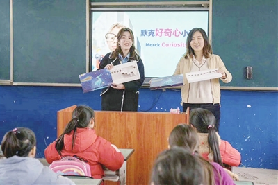 近日,默克公司志愿者来到护村小学,举行默克好奇心课堂授课和爱心捐赠活动。