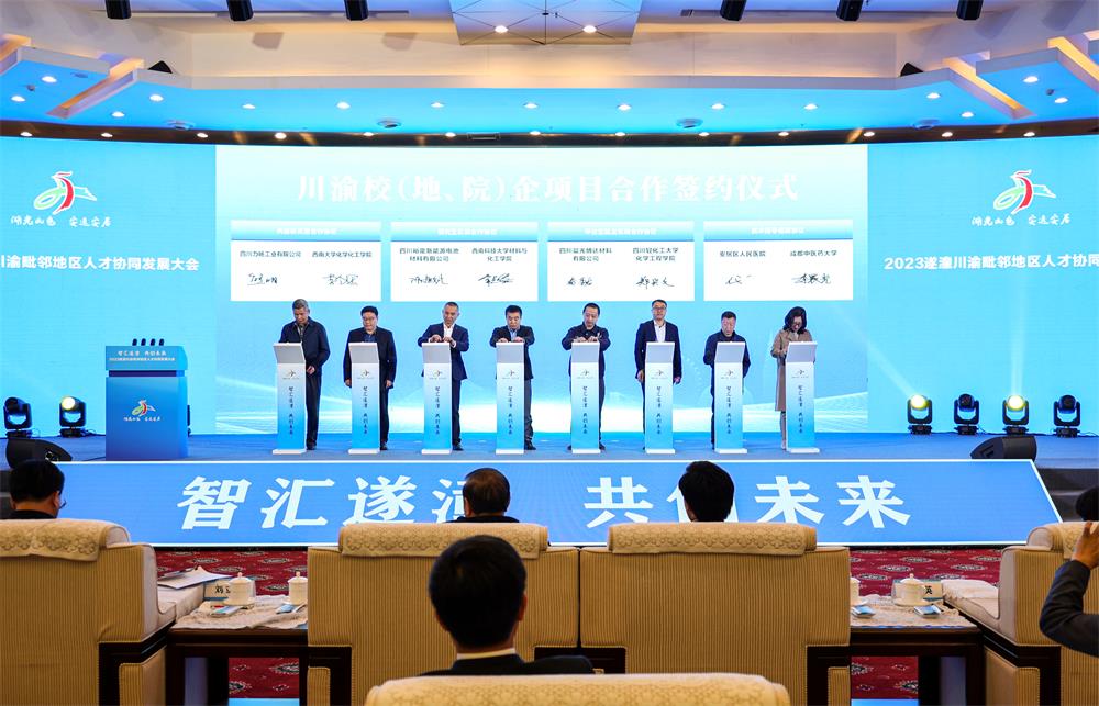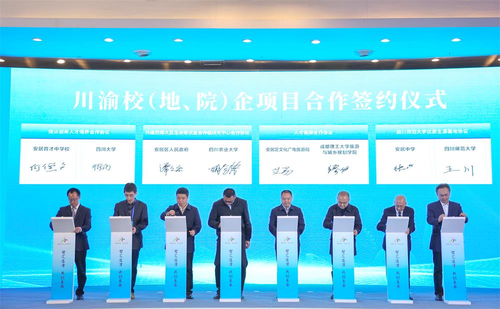 安居区与潼南区相关部门分别签订共建锂电产业联盟合作协议、遂潼教育发展联盟协议、党外知识分子互派互助共建共育合作协议;安居区人民政府与四川农业大学乡村振兴学院签订建设西南大豆玉米带状复合种植研究中心合作协议;成都理工大学旅游与城乡规划学院、四川大学材料科学与工程学院、四川师范大学、西南大学化学化工学院、西南科技大学材料与化工学院、四川轻化工大学化学工程学院、成都中医药大学分别与安居区有关部门、学校、企业签订校(地、院)企合作协议;重庆欧美同学会(重庆留学人员联谊会)、四川省欧美同学会(四川省留学人员联谊会)、潼南区委统战部与遂宁市委统战部签署战略合作协议。通过签约促成项目落地进而转化为共享成果,进一步增进川渝之间的深入了解,进一步拓展川渝合作的全新领域,实现巴山蜀水“同频共振”。