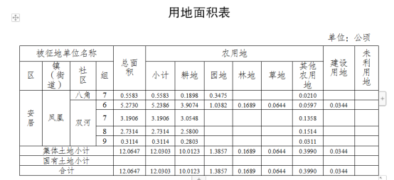本次征收遂宁市安居区凤凰街道八角社区7组,双河社区6、7、8、9组等土地共计12.0647公顷,用地面积见下表。
