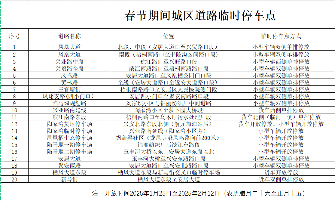 春节临近,城区车流量大幅度增长,停车需求增大。为给大家提供一个方便、畅通的交通环境,2025年1月25日-2025年2月12日(农历腊月二十六至正月十五)期间,安居城区将设置小型车辆、货车临时停车点及停车场,方便市民停车。