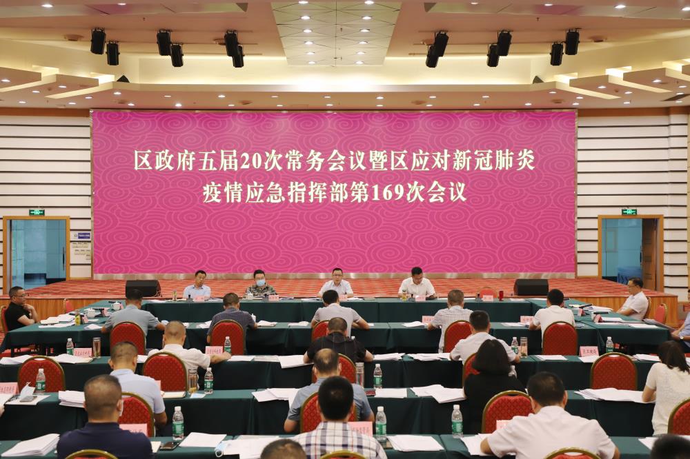 7月19日,区委副书记、区长、区应对新冠肺炎疫情应急指挥部指挥长杨文彬主持召开区政府五届20次常务会议暨区应对新冠肺炎疫情应急指挥部第169次会议,传达学习习近平总书记近期重要指示精神以及中央和省、市相关会议精神,安排部署防汛救灾、安全生产、疫情防控、大气污染防治、粮食生产等当前各项重点工作。