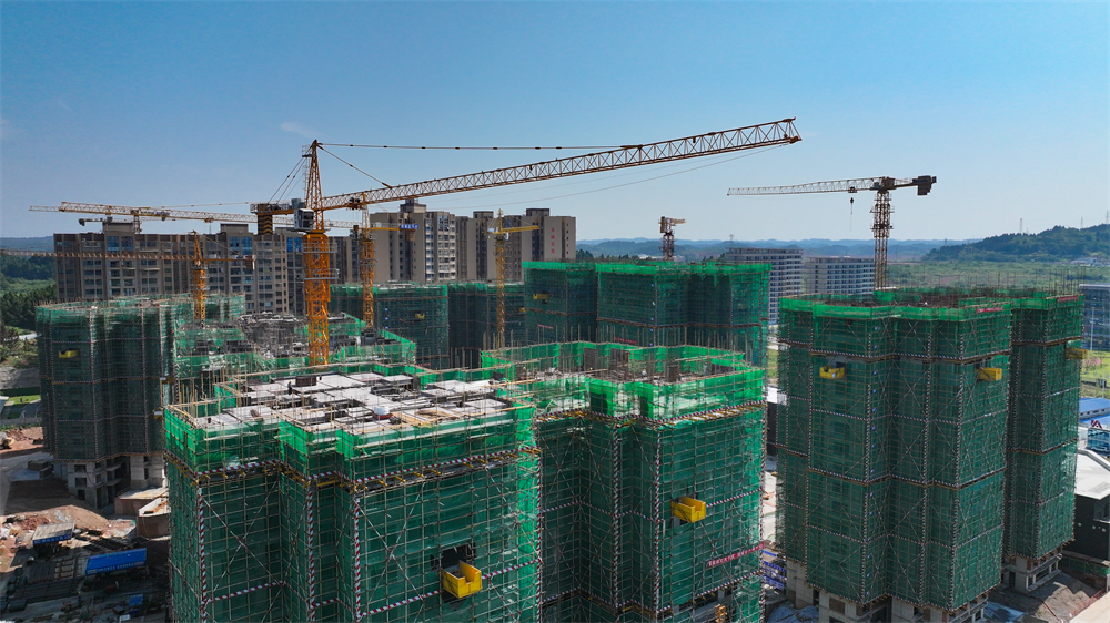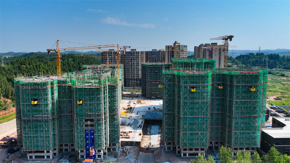 目前,8栋高层住宅楼正拔地而起,配套的商业楼和邻里中心已初具规模:6号楼已顺利封顶,5号楼即将封顶,其余6栋主体结构施工进度均超95%。“目前,我们已投入了480余名施工人员,全力抢工期、抓进度。”安居区东城二期棚户区改造项目生产经理朱进介绍,“按当前进度,预计8月底可实现全部楼栋封顶。”在推进主体结构施工的同时,内部装饰装修工作也正同步展开,所有楼栋砌体工程均已进场,进度最快的已施工至12层。