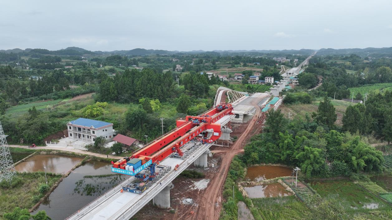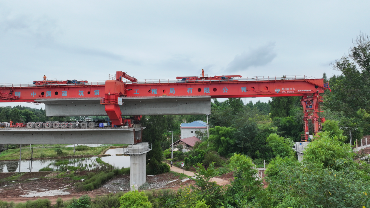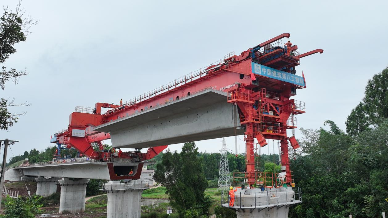 10月3日,在中兴镇成达万高铁项目堆子山村2号大桥建设现场,现场机器轰鸣,运梁车缓缓将一孔长32.6米、重达700吨的箱梁运送至桥位,架桥机精准地将这片“巨无霸”箱梁稳稳地安放在桥墩之上。
