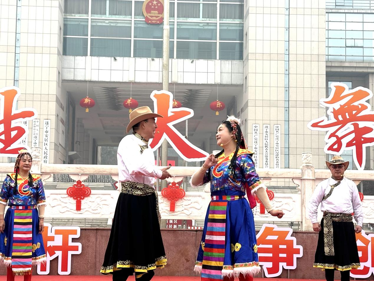 为丰富市民游客群众精神文化生活,营造热烈、喜庆、祥和的节日气氛,让市民和游客欢欢喜喜过新年,1月29日,大年初一,以“金蛇献瑞贺新春·安逸安居启新程”为题的“引客入遂到安居”新春游园会在和谐广场正式拉开帷幕。