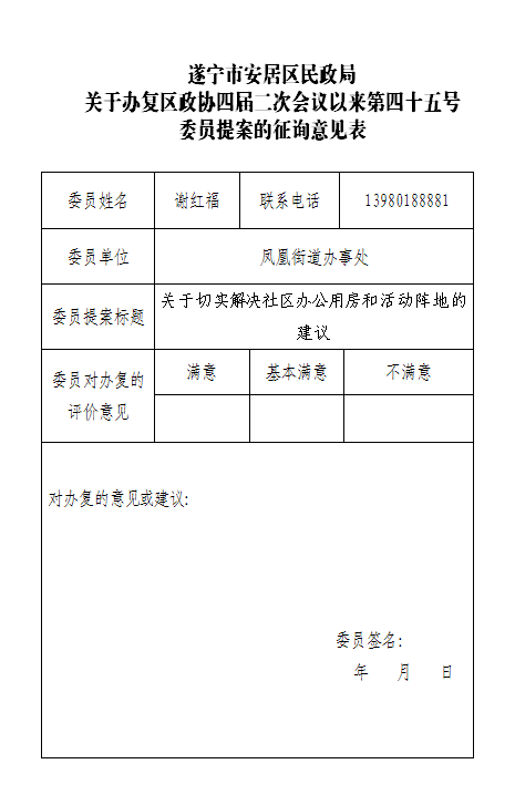 今年区委、区政府安排财政专项资金400万元用于推进智慧社区试点建设和解决部分社区无办公用房的问题,我们将有重点地先行解决一部分老旧小区和无办公用房社区的办公用房和活动阵地建设,目前正在进行建设点位选择及前期考察等工作。同时,我们也在积极争取中央、省委、市社区服务站建设专项资金。近两年来,区政府按照市政府要求,结合我区实际,加大投入力度,补齐社区建设“短板”,相信我区社区阵地建设和公益性服务设施建设将逐步得到改观,为推进社区治理能力提升创造条件。