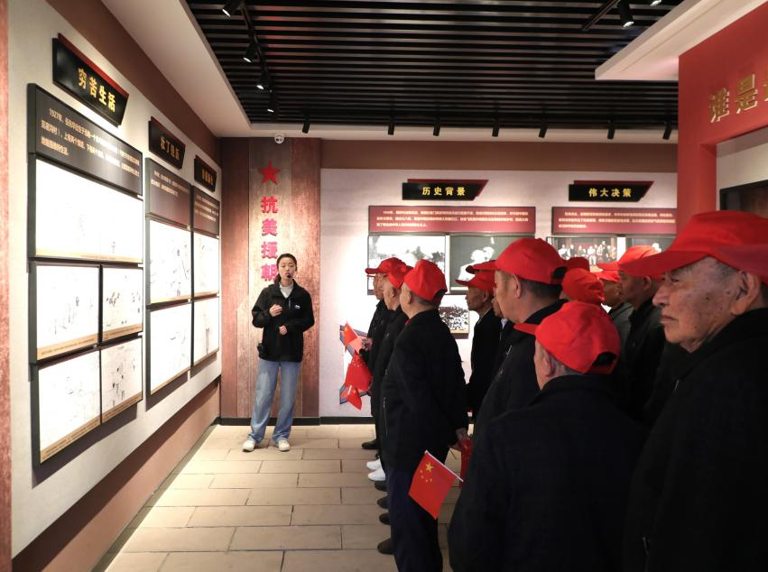 在伍先华旧居,老人们驻足观看了有关先烈事迹的宣传视频,讲解员从穷苦生活、壮丁经历、重获新生、历史背景等内容入手,讲述了伍先华从穷苦的普通人成长为一名抗美援朝战士的历程。