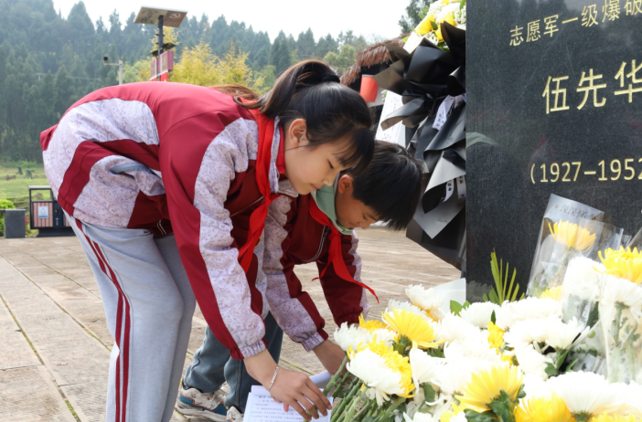 上午9时许,在老师的组织下,少先队员代表整齐列队,向烈士雕像敬献花篮。全体师生手持白菊,面向伍先华铜像默哀三分钟,随后依次献上鲜花与手写纪念卡。
