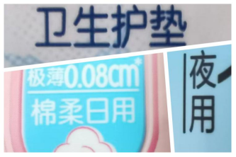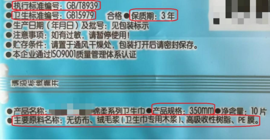 2.查看产品标识:卫生巾外包装应包含产品名称、长度、内装数量、生产日期和保质期、生产批号和限用日期、卫生许可证号、执行的标准编号(GB 15979、GB/T 8939等标准)、生产企业名称地址和联系方式、主要原料、产品合格标志等信息。