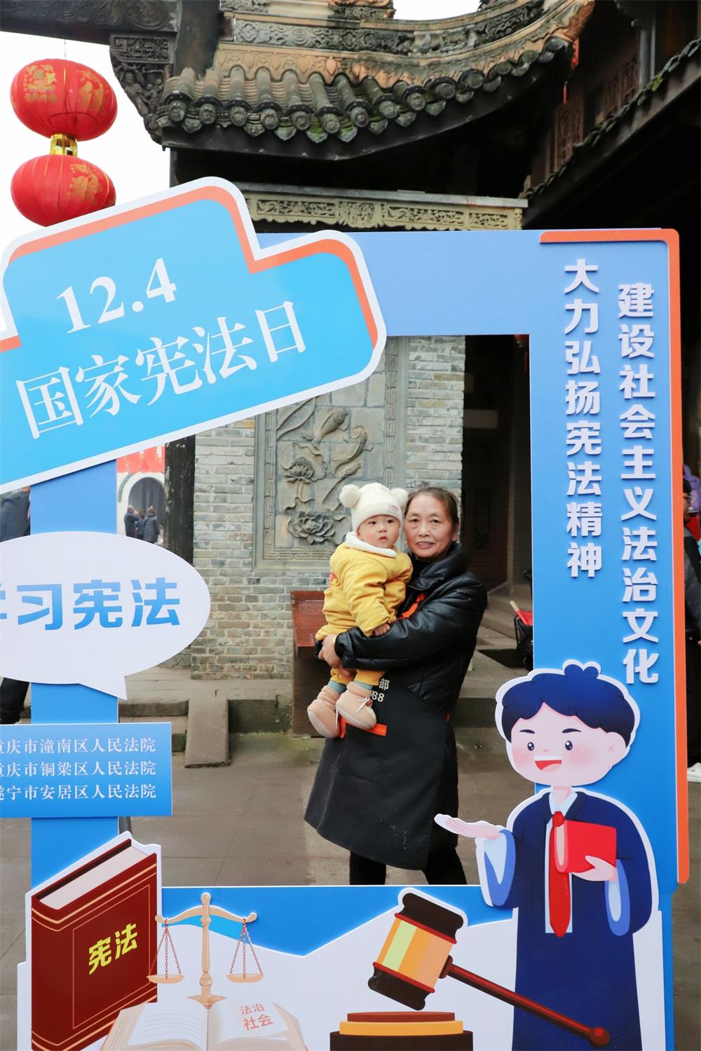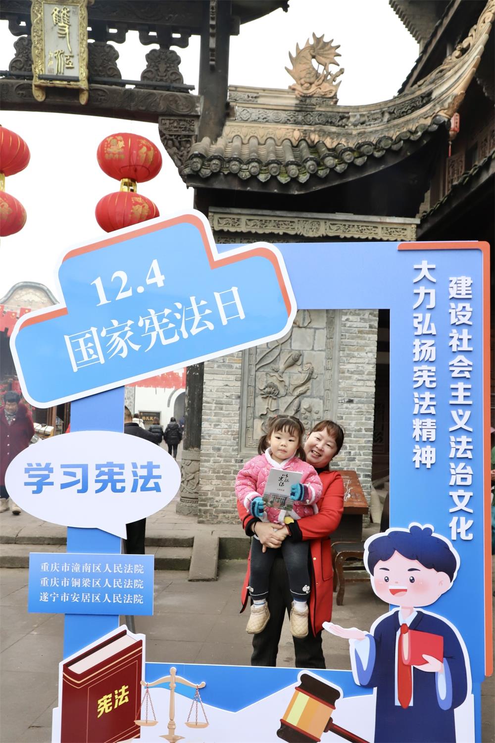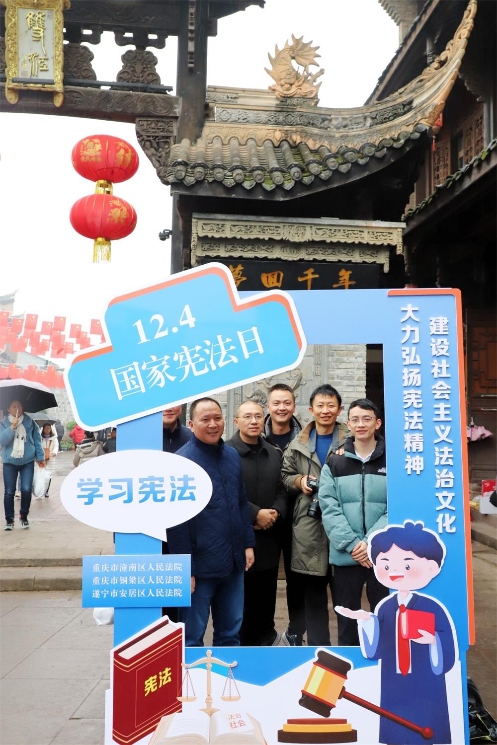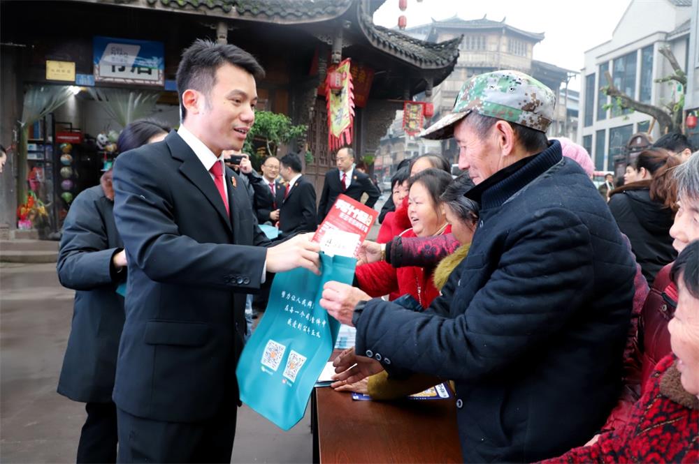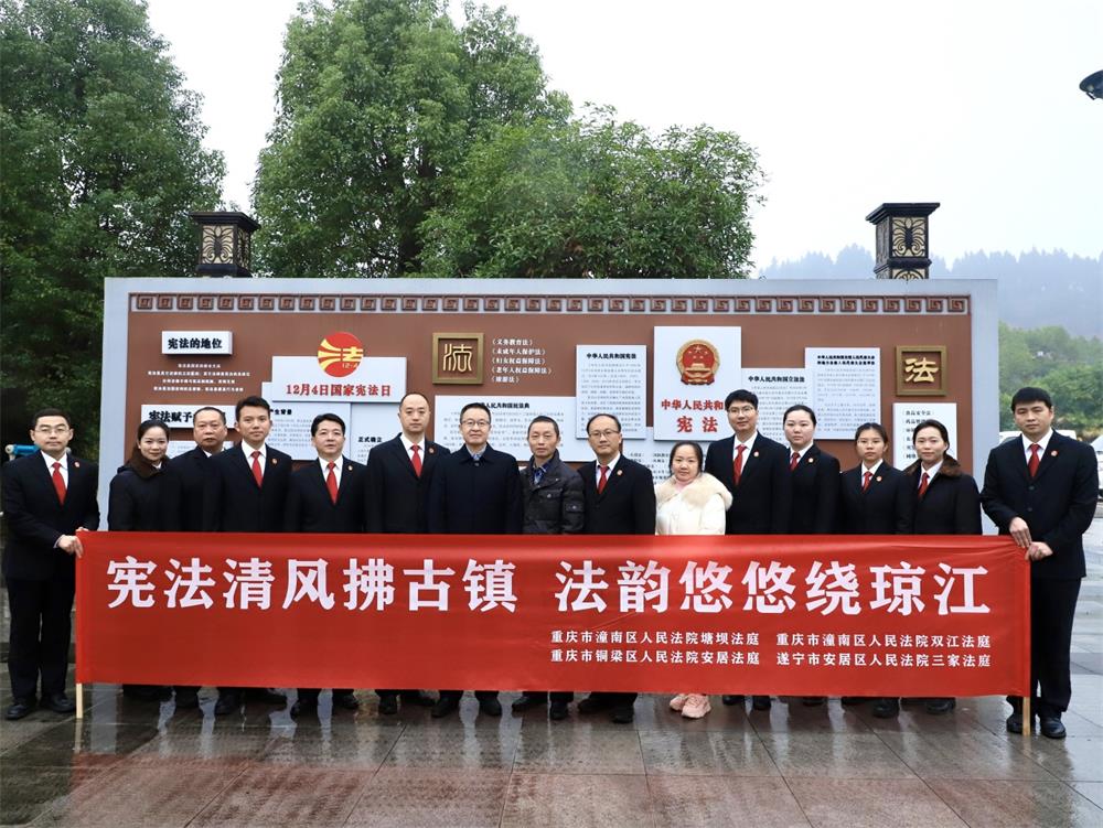 为大力弘扬宪法精神,彰显宪法权威,进一步深化川渝毗邻地区司法协作,丰富拓展琼江流域“纽扣法庭”工作机制的内涵和外延,12月4日,遂宁市安居区人民法院三家法庭携手重庆市潼南区人民法院塘坝法庭、双江法庭和重庆市铜梁区人民法院安居法庭,一同前往潼南区双江古镇开展“12·4”国家宪法日主题普法宣传活动,共同唱好法院跨域司法宣传重头戏。川渝两地人大代表应邀参加此次活动。