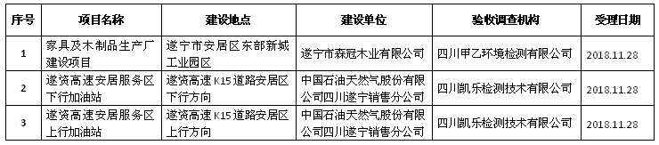 根据建设项目竣工环境保护验收管理有关规定,2018年11月28日,我局受理了3个建设项目竣工环境保护验收申请。现将受理情况予以公告。如有建议意见,请于2018年12月4日前向我局提出。