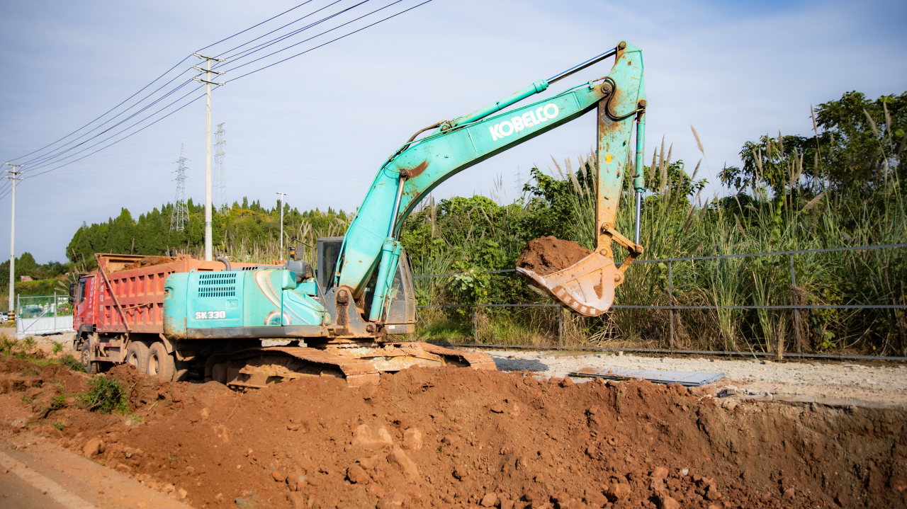 在安东大道北段的施工作业区域,施工人员在各作业点忙碌,挖掘机铁臂起落间精准挖开深沟,雨污管网的轮廓一点点勾勒出来,运输车辆来回穿梭转运土方,为后续工程打下基础。