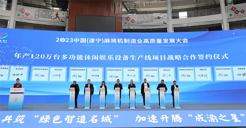 3月31日,2023中国(遂宁)制造业高质量发展大会在遂宁市安居区召开。大会以“共筑绿色智造名城、加速升腾成渝之星”为主题,来自世界各地的麻将制造企业家齐聚安居,聚焦聚力国际麻将制造业高质量发展广泛交流、签署产业链合作协议、发布高质量发展共同宣言。