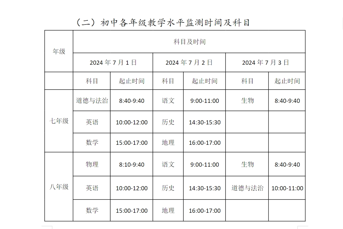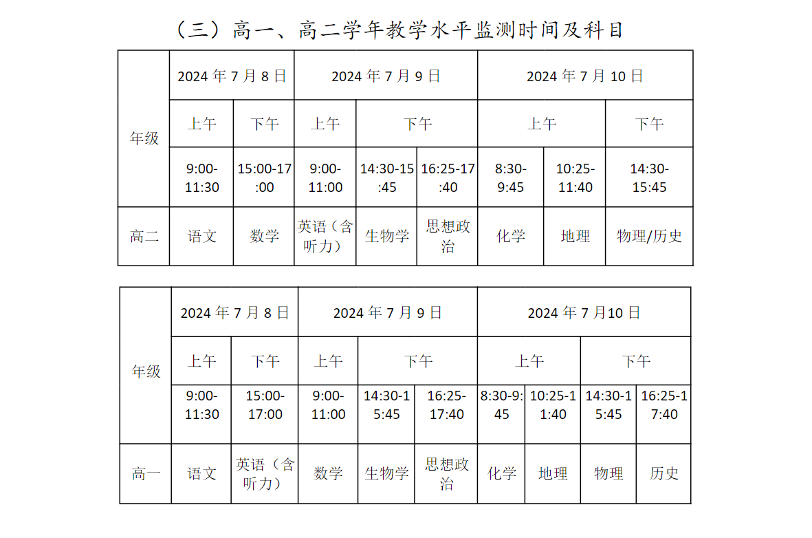 普通高中一、二年级学生于7月10日考试结束后离校。