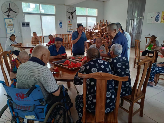 虽然户外是三十多摄氏度的高温,但食堂内的空调却恒定在26摄氏度,大家欢聚一堂,吃着敬老院工作人员切好的西瓜。趁着清凉,大家围坐在一起聊天话家常,俨然是一派其乐融融的温馨氛围。