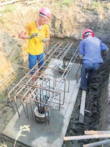 下午4点,建设工地上,挖掘机机声隆隆,运料车、水泥车来回穿梭。42岁的建筑工人张坤正在烈日下忙着捆扎钢筋,安全帽下被汗水打湿的头发紧贴着额头,脸上的汗珠顺着皱纹往下滴落。为了补充水分,他不时拿起身边的大水壶,咕咚咕咚地喝起来,随后也给自己的脸上、身上喷点水,降降温。“这些钢筋先在工棚里加工,做成一个个固定形状的钢筋骨架,然后再把骨架安装到工地的各个位置上。”钢筋工基本是露天工作的,由于长时间暴晒,张坤的脸和手臂明显比其他建筑工人要黑得多。