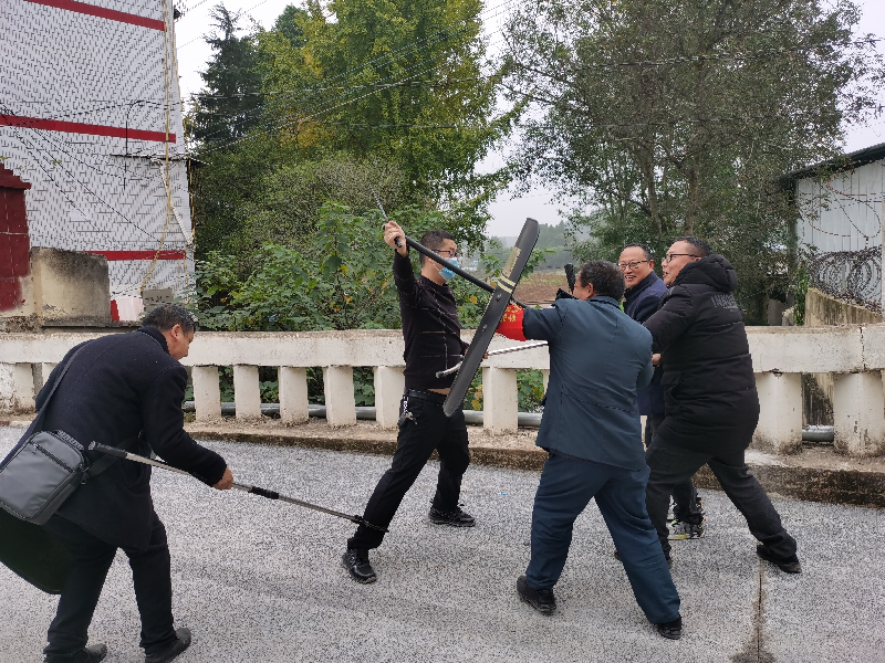 演练模拟了一名暴徒手持危险器械,企图强行闯入校园的场景。面对突如其来的紧急情况,学校安保人员与防暴组老师临危不乱,手持钢叉、盾牌、棍棒等,将“歹徒”围住,与“歹徒”交涉、周旋。经过1分钟的搏斗,防暴组老师与门卫一起合力将进入校园的“歹徒”制服,校园恢复正常秩序。