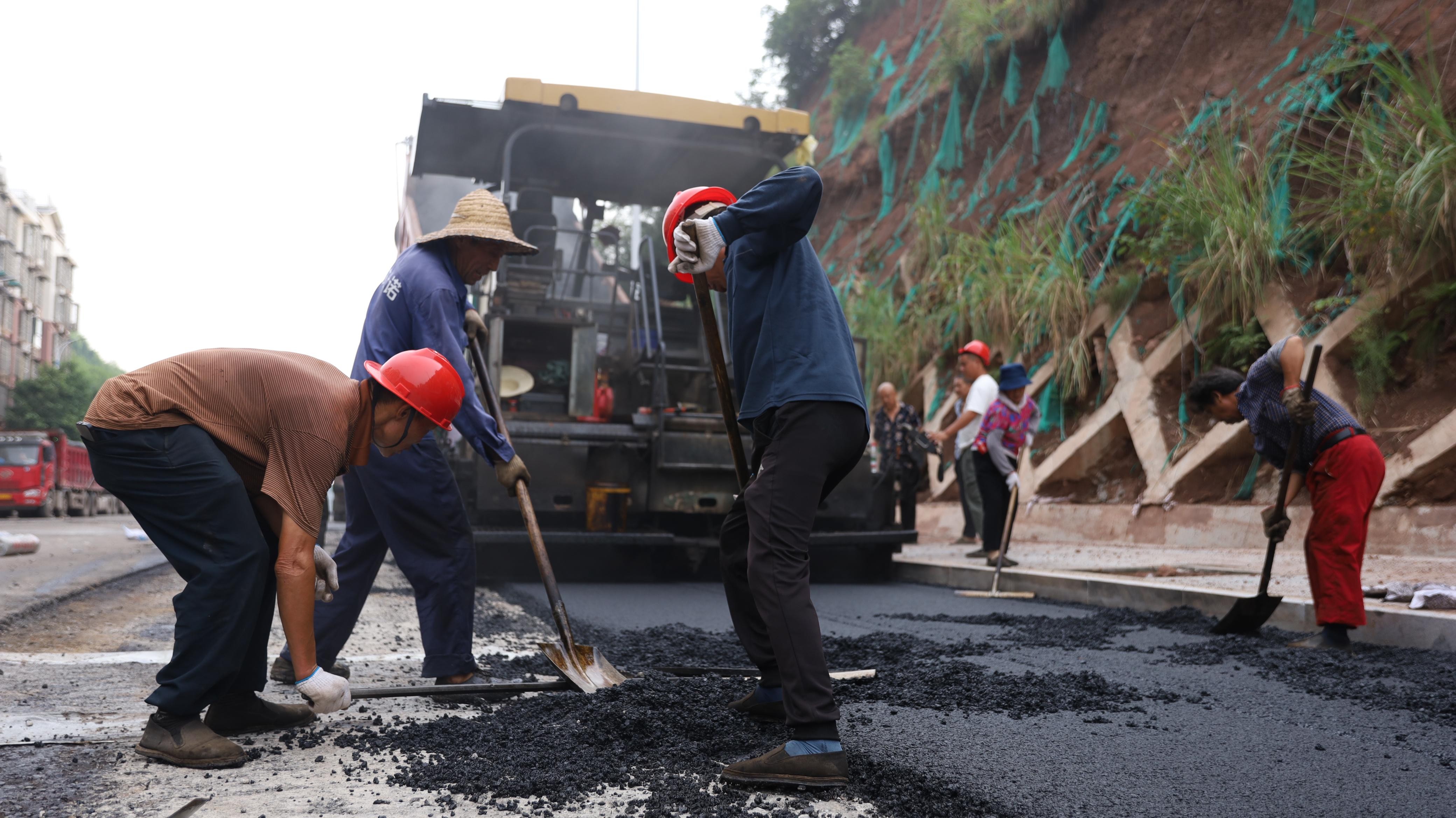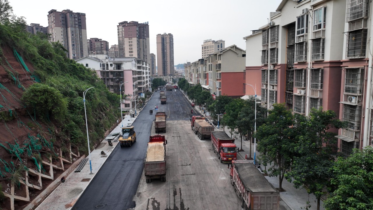 在安居区老城区排水整治建设项目二期(二标段)聚安南路段施工现场,道路沥青铺设工作也在火热进行,各类机械设备与工人互相配合,现场一派忙碌景象。