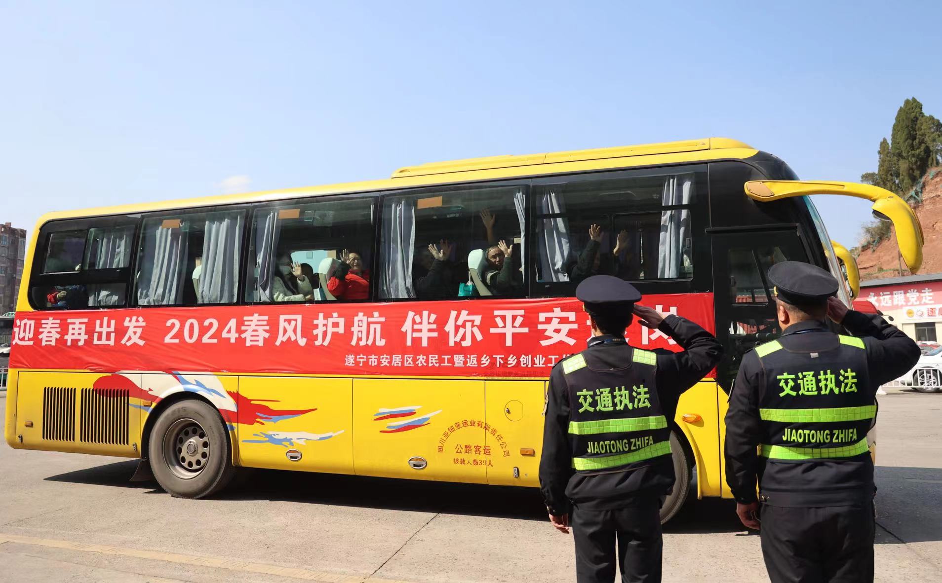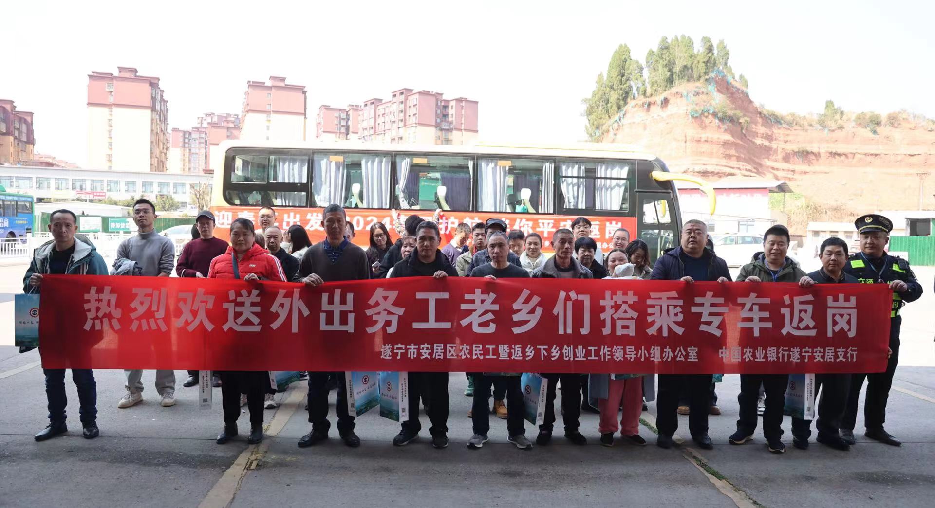 春节假期刚过,各地企业陆续复工,为保证务工人员安全便捷返回工作岗位,安居区农民工服务中心与区交通运输局联合协调,开设专车,实行“点对点”运输,使务工人员返岗之路既安全又便捷。发车现场,相关单位负责同志到现场为农民工送上面包、牛奶、矿泉水、返乡创业政策资料等暖心大礼包。