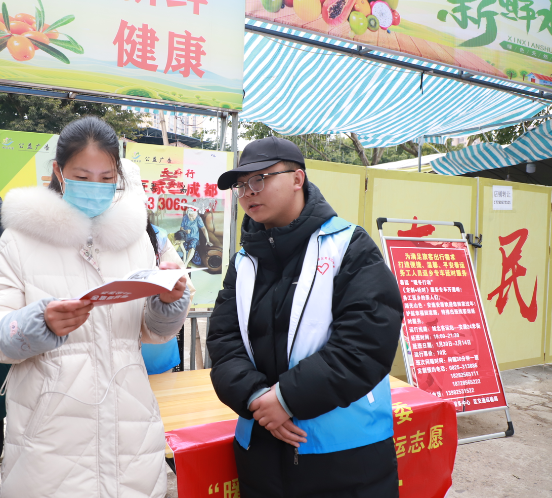 据了解,为确保每一位在外务工的人员都能顺利、安全、舒适地回到家中,区交运局、区农民工服务中心在春运期间专设了38台农民工服务专车,截至目前已服务务工返乡人员2300余人次,其中夜班延时服务约300人次;并在各个交通站点设置了交通咨询志愿者服务站点、返乡务工人员服务站点,可免费为乘客提供引导、咨询服务,此外,还储备了口罩、酒精等医疗物资2000余份,免费向群众发放。