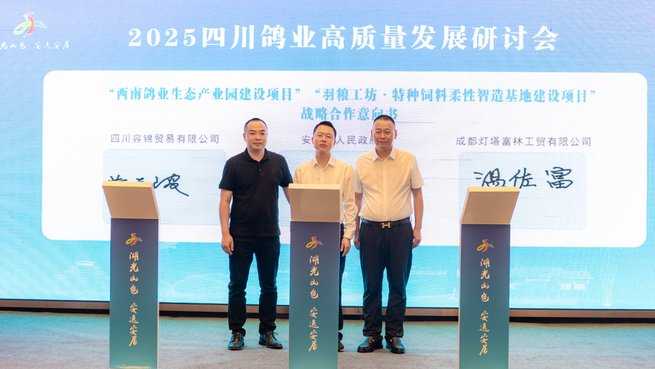 会上,安居区人民政府分别与四川容锦贸易有限公司、成都灯塔富林工贸有限公司签署了《西南鸽业生态产业园建设项目》和《羽粮工坊·特种饲料柔性智造基地建设项目》战略合作意向书。四川省信鸽协会授予安居区隆益翔养殖有限公司“四川省信鸽训练基地”称号,进一步夯实产业发展基础。