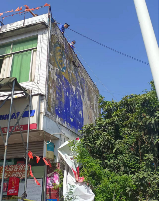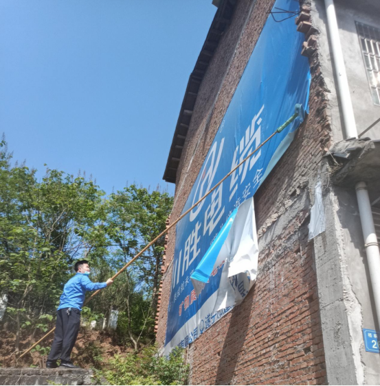 为保障市容秩序,确保市民出行安全,执法人员对318沿线破损墙体广告进行全面排查,并对破损墙体广告进行了清理。共计清理破损墙体广告6处400余平方米。