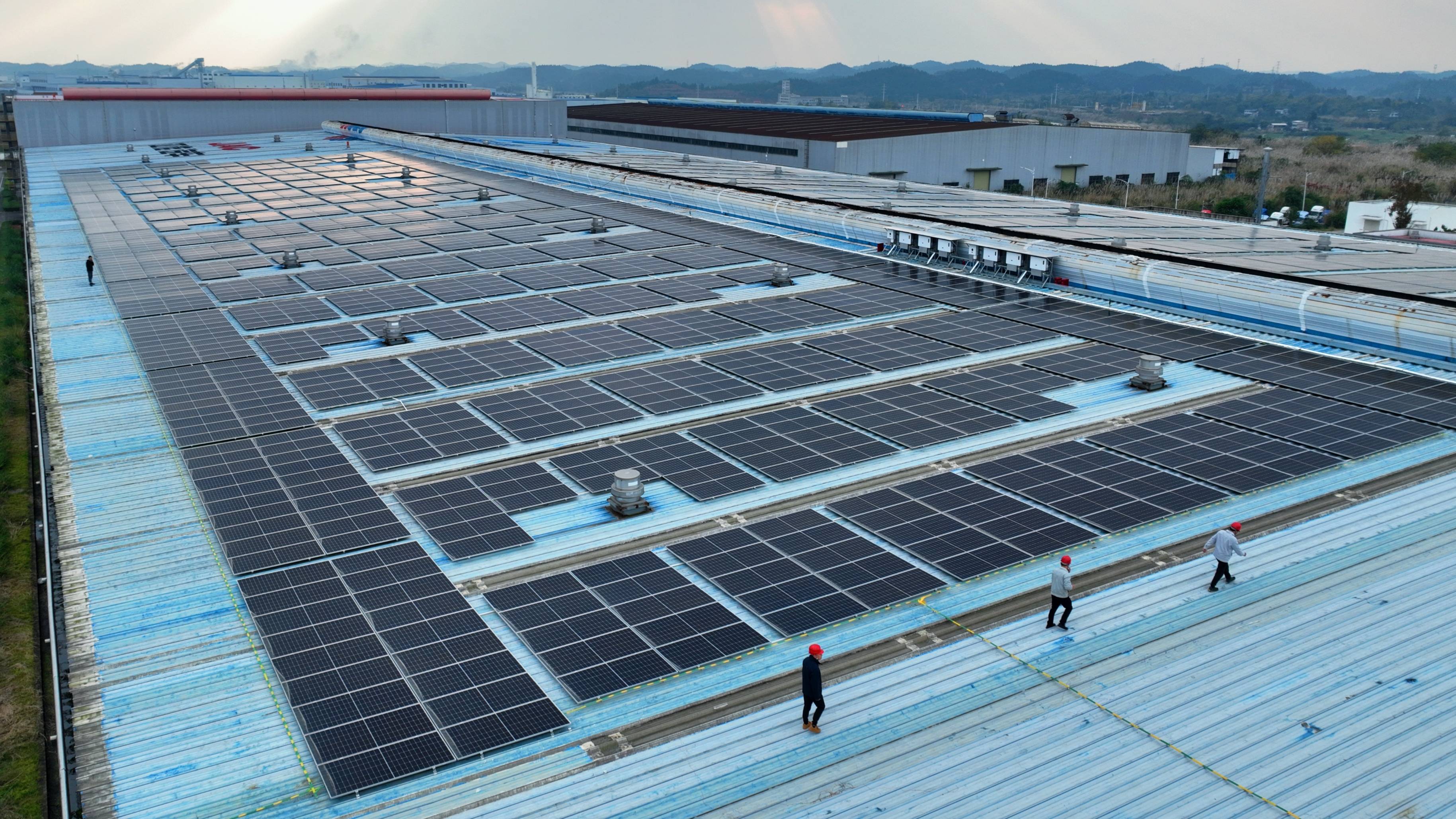12月4日,空中俯瞰安居经开区的四川江淮汽车有限公司,屋顶上整齐排列的光伏板在阳光下熠熠生辉。这是该公司实施的工业厂房“第五立面”改造光伏发电项目,预计本月底投产。