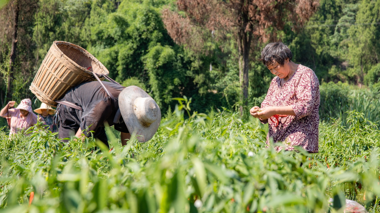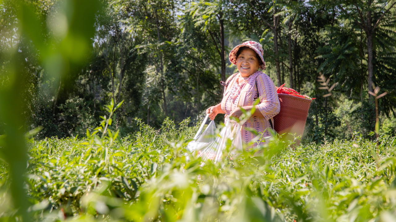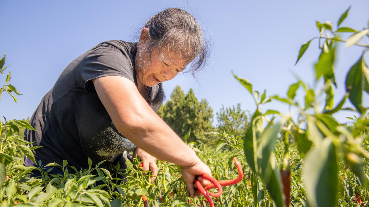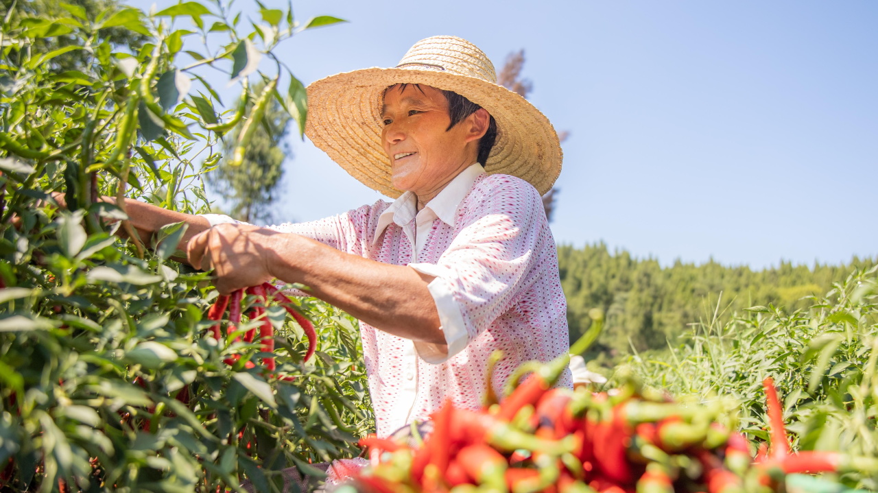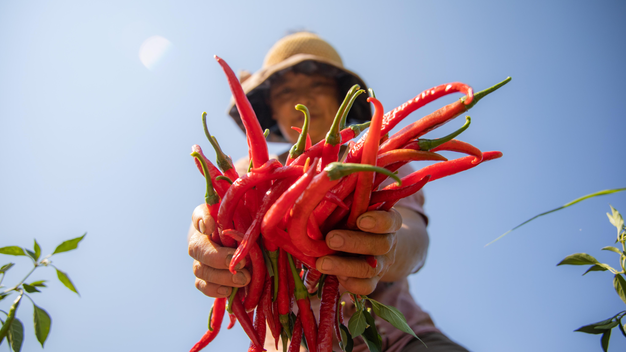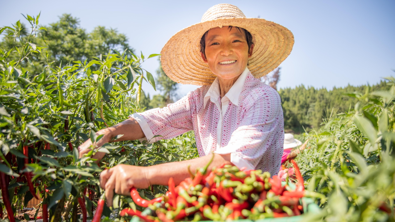 红彤彤的辣椒映得她笑容格外灿烂