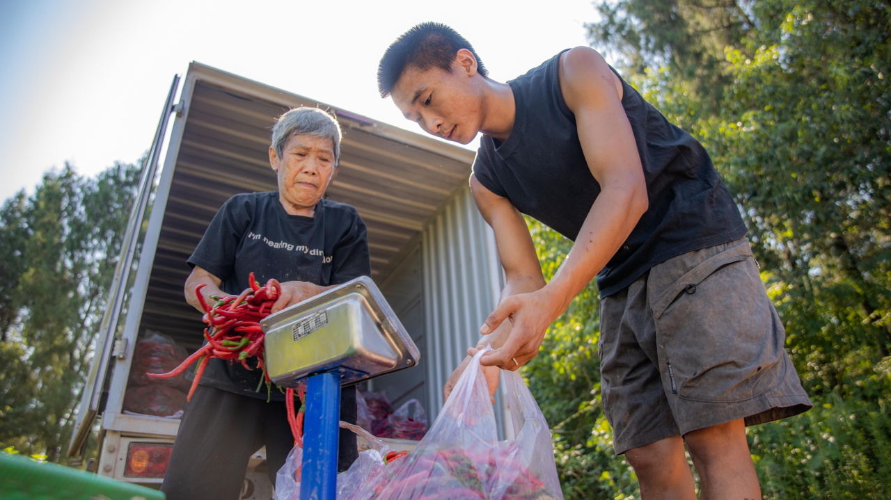 将刚采摘的辣椒称重、装袋