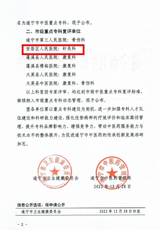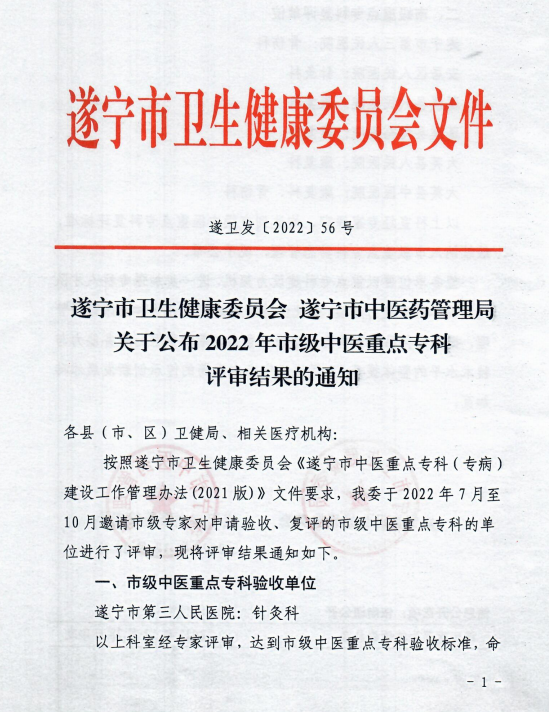 近日,遂宁市卫健委和遂宁中医药管理局共同下发《关于公布2022年市级中医重点专科评审结果的通知》,我院针灸科经过专家组的严格验收后,顺利通过复评榜上有名!