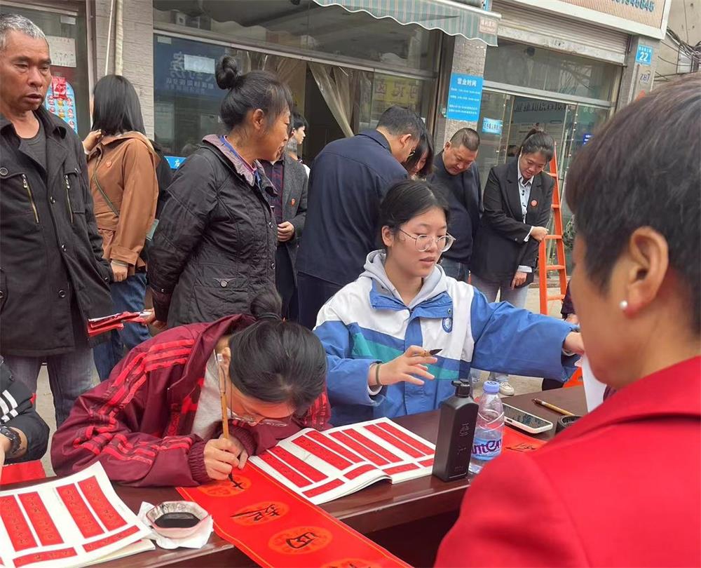 在磨溪镇场镇,由书法爱好者组成的志愿者们饱含热情、挥毫泼墨,手起笔落间,一幅幅寓意喜庆吉祥的对联、一个个端庄的“福”字瞬间呈现,每一幅精美的对联都是群众的一份祝福。