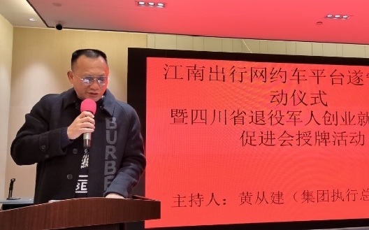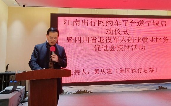 江南出行董事局主席李晓东致辞,他对四川省军促会为江南出行四川营运中心成为副会长单位并授牌表示热烈祝贺,江南出行网约车平台在遂宁开业表示诚挚的感谢!江南出行秉持为用户提供安全、舒适和便捷出行理念,遂宁作为新的起点,川渝起航之地,一定提供高质量服务,为遂宁乃至全川民众出行和退役军人就业创业服务,并将作为服务的标杆,大力向全国其他省市进行重点宣传和推广。