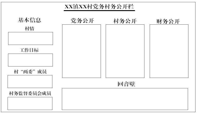 村(社区)党务村(居)务公开形式要以公开栏为主,每个村(社区)都应设立公开栏,较大的村(社区) 还应遵循便民的原则,在相对集中的村组、聚居点设立公开栏。要统一公开栏模版,除规章制度、村规民约、居民公约、发展规划等长期公开内容外,减少公开栏分类,将动态性、阶段性和常规性公开内容统一规范在村(社区)党务公开栏、村(居)务公开栏、财务公开栏和公告通知栏内进行公开,避免公开栏分类过多过杂。公开栏旁应设立“意见箱”并公布监督电话,广泛收集村(居)民意见或建议。