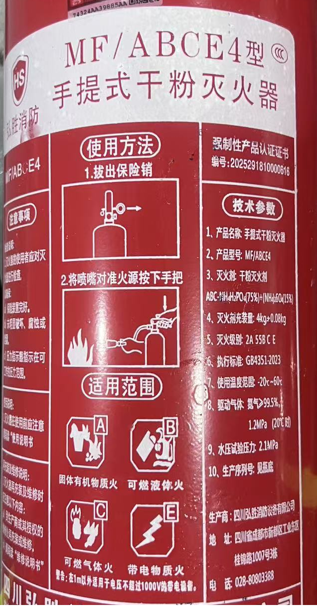 2.查看产品标识。手提式灭火器为强制性认证产品(CCC认证),产品上应标示CCC标志的符号,可通过全国认证认可信息公共服务平台查询生产企业的获证情况,并与购买产品比对,确保产品名称、规格型号、证书编号等内容一致,避免购买“三无”产品。还应查看是否标明灭火器名称、型号、灭火种类代号、灭火级别、使用温度、使用方法(图形和文字)、驱动气体名称和数量(或压力)、筒体生产连续序号(也可用钢印打在底圈或颈圈等部位)、制造厂名称等。