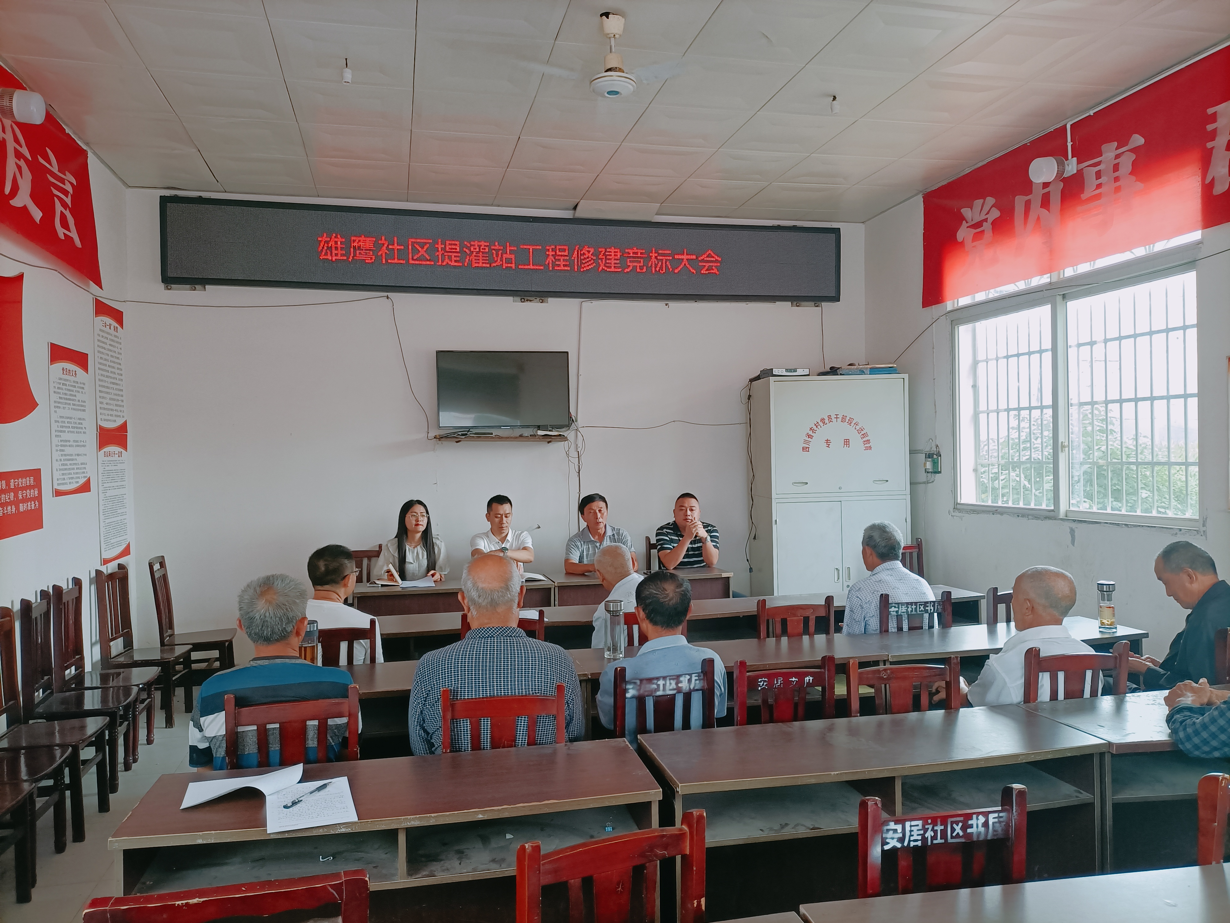 为了提高农业生产能力,保障群众日常生产生活用水需求,提升群众的幸福感和获得感。2024年6月25日,凤凰街道吕主任、黄主任到雄鹰社区参与雄鹰社区提灌站建设施工队招标会,就提灌站建设施工进行讨论。大家一致认为,要科学设计建设方案,规划提灌站的长度和途经路线,尽量靠近农田和受旱严重的区域,尽量不占用耕地,组织专业施工队施工。