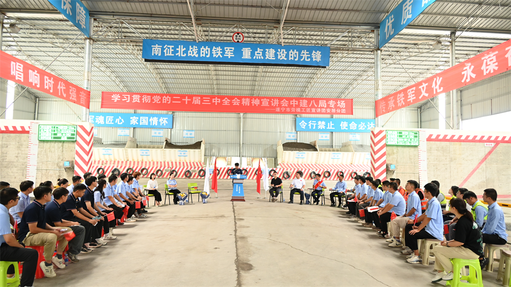 为深入学习宣传贯彻党的二十届三中全会精神,统一项目一线广大职工的思想,助力重大项目高质高效建设,9月29日,遂宁市劳模工匠宣讲团安居分团走进中建八局安居制梁场,开展党的二十届三中全会精神集中宣讲活动,50余名项目一线职工聆听宣讲。