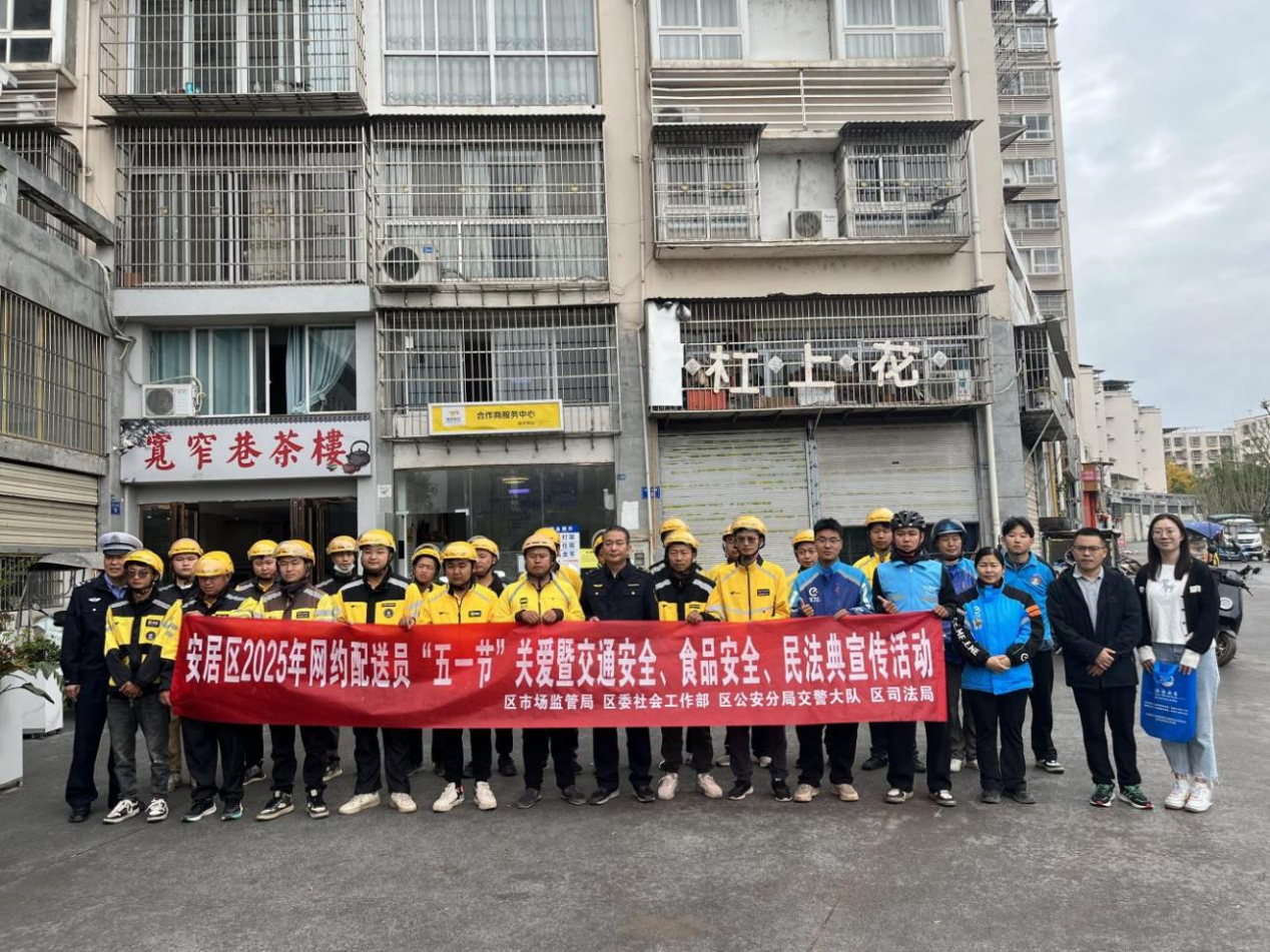 近日,区市场监管局联合区委社工部、区司法局、区交警大队开展2025年网约配送员“五一”关爱暨交通安全、食品安全、民法典宣传活动。安居美团、饿了么外卖公司25名骑手参加活动。