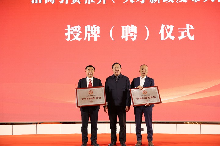 吴军向四川天府新区安居商会授牌、授印;黄元章向杨继瑞颁发四川天府新区安居商会顾问聘书;田斌向四川天府新区安居商会名誉会长授牌颁证;何志尧、蒋海斌、谢天、李效白向四川天府新区安居商会会长、监事长、常务副会长授牌;喻小春、王毅、胡恒向四川天府新区安居商会副会长授牌。