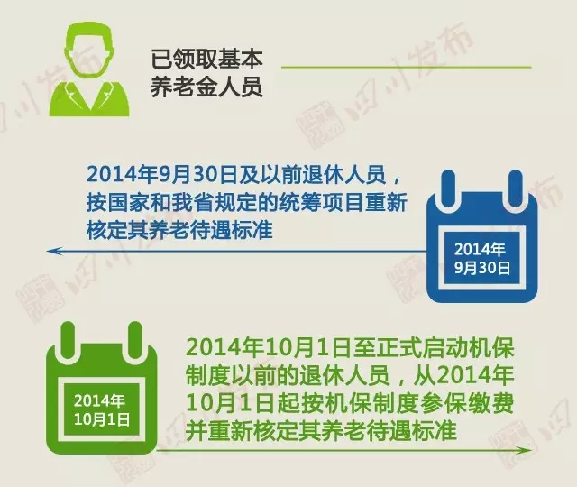 2014年10月1日至我省正式启动机保制度经办工作以前办理退休(职)手续并领取待遇的人员,单位和个人应在转移养老保险关系和个人账户的基础上,从2014年10月1日起按机保制度参保缴费并重新核定其养老待遇标准,从其在原试点领取待遇的当月起按重新核定的养老待遇标准执行。