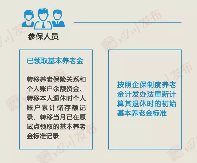 已领取基本养老金的人员(不含已参照企保制度执行的原试点参保人员),除转移养老保险关系和个人账户余额资金(含利息)外,还应转移本人退休时个人账户累计储存额记录和转移当月已在原试点领取的基本养老金标准记录。经办机构按照企保制度养老金计发办法重新计算其退休时的初始基本养老金标准(按本人实际缴费基数计算的指数在0.6—3.0之间的按本人实际指数计算,高于3.0的按3.0计算,低于0.6的按0.6计算),并从其退休次年起参照我省企保制度历年调待政策,核定其转移至企保制度当月应领取的基本养老金标准(如核定的标准低于本人在原试点领取的标准,则按原试点标准执行),由企保经办机构从其转移至企保制度当月起按核定的标准发放基本养老金,并参加企保制度以后年度调待。