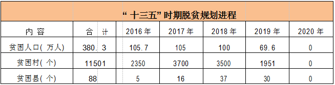 ——确保380.3万建档立卡贫困人口全部脱贫。如何让如此庞大的数字化有为无?根据《规划》,从380.3万走到“0”,就需要在2016年帮助105.7万建档立卡贫困人口脱贫,2017年105万人口脱贫;2018年100万人口脱贫;2019年,剩下的69.6万人口也全部脱贫。