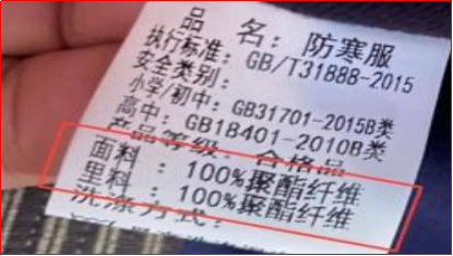 里料面料为不同材质时,应分别标注面料、里料(胆料)的成分及含量。有填充物的,应标明填充物种类,若填充物为羽绒,还应标明绒子含量及充绒量等。(面料成分特殊要求:若执行标准为GB/T 31888-2015,校服直接接触皮肤的部分,其棉纤维含量标称值应不低于35%)